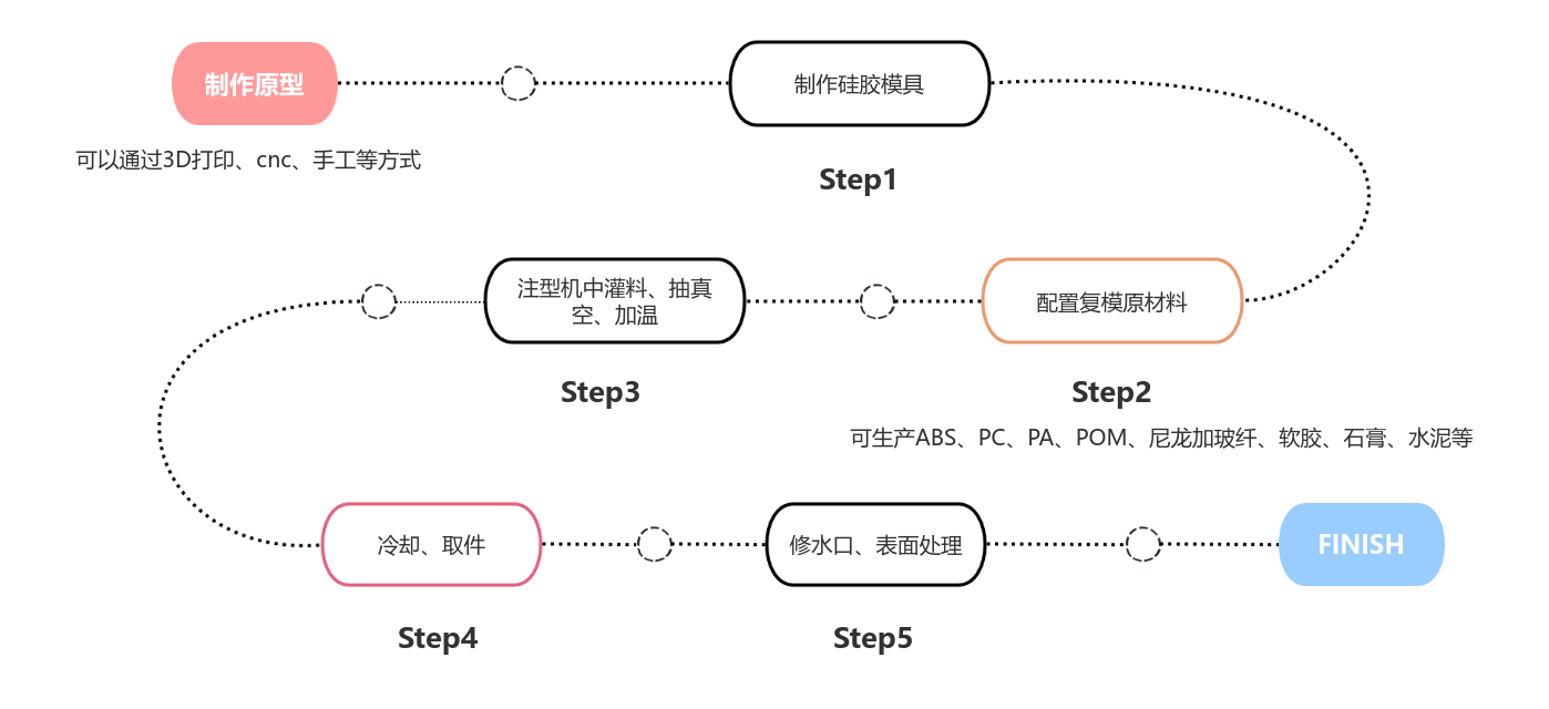 其核心原理是先以设计好的原型(可以是3D打印件、手工模型或其他材质的样品)为基础,用液态硅胶浇筑包裹原型,待硅胶固化后形成具有原型轮廓的模具型腔,随后将树脂、塑料等液态材料注入模具,经固化、脱模后得到复制件。